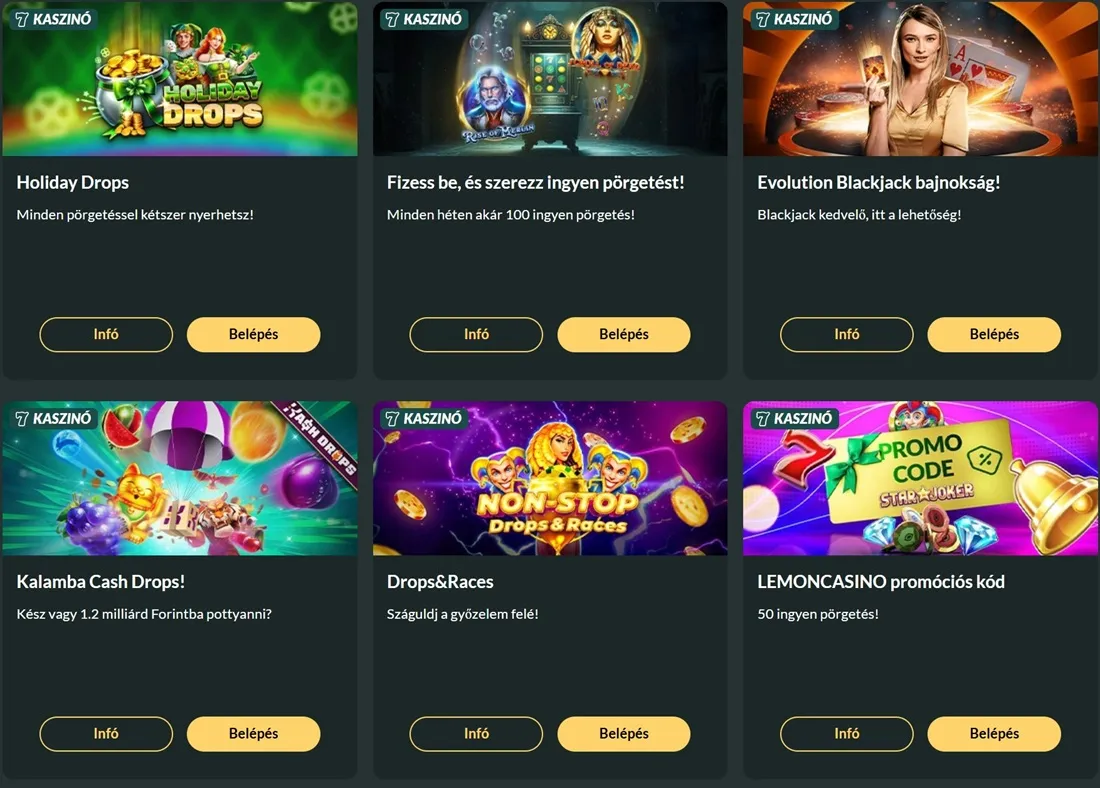 A platform ezen felül 5.400 játékot tett elérhetővé a hagyományos és élő kaszinó szekcióban egyaránt. A szolgáltatók is sokszínűek, 48 különböző szolgáltató közül válogathatsz, amelyek között a legnépszerűbb és kevésbé ismert nevek egyaránt megtalálhatók. Nem meglepő módon a kaszinó szekcióban a legnépszerűbb fejlesztők a Pragmatic Play és az Evolution, de ezen kívül megtalálható itt a NetEnt, Novomatic, Spribe és még sok más jól ismert szolgáltató játékai. Az élő szekcióban több, mint 410 játék kapott helyet, ezek között minden kategória képviselteti magát, így a klasszikus kaszinójátékok és az újabb címeket egyaránt élőben játszhatod. Emellett a platform nagy előnye, hogy izgalmas és jövedelmező folyamatosan elérhető promóciókat szolgáltatnak a meglévő játékosok számára, amelyeket te is megtalálhatsz a promóciók menüpont alatt. Reload, cashback, ingyenes pörgetés és VIP bónuszok egyaránt megtalálhatók itt.